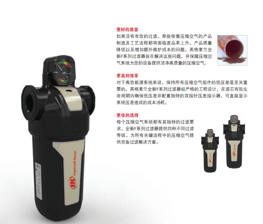 全新F系列過(guò)濾器提供品質(zhì)達(dá)到ISO8573空壓機(jī)品牌:1-2010標(biāo)準(zhǔn)要求的潔凈空氣并經(jīng)第三方認(rèn)證符合I5O12500-1標(biāo)準(zhǔn)。多種過(guò)濾等級(jí)產(chǎn)品構(gòu)成完備的過(guò)濾解決方案,滿足特殊的空氣質(zhì)量要求。