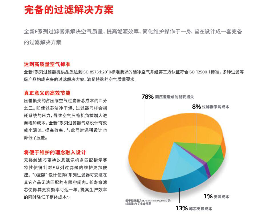 壓差損失約占?jí)嚎s空氣過(guò)濾器總成本的四分之三。即使濾芯潔凈干燥,過(guò)濾器同樣會(huì)損耗系統(tǒng)的壓力,導(dǎo)致空氣壓縮機(jī)負(fù)載增大進(jìn)而增加成本。全新F系列過(guò)濾器氣路設(shè)計(jì)有效減小滿流,提高效率,與此同時(shí)深褶設(shè)計(jì)也降低了壓差。